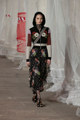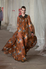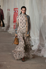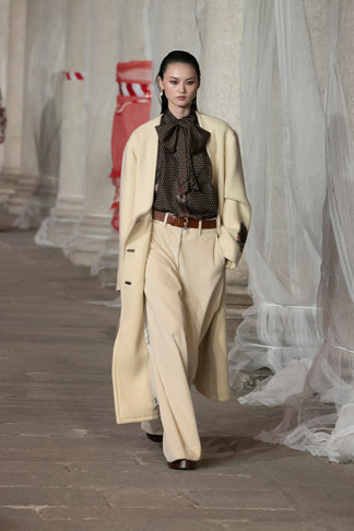 Il tailoring è alto e preciso, in tessiture opulente. Motivi cravatta brulicano su cappotti avvolgenti con stampe a contrasto all’interno. I pantaloni di jeans accennano, in effetti, ad un look radicale. Essendo Etro un mondo intero, si prendono in prestito elementi dell’arredo domestico, con coperte avvolte su abiti leggeri. Le frange danzano lungo l’orlo di pesanti polo e sciarpe, mentre le applicazioni conferiscono alle maglie argyle un fascino tridimensionale. Gli accessori sono altrettanto radicali: gli zoccoli Aladdin diventano stivali, mentre lucide Mary Jane hanno tacchi alti e plateau. Le borse oversize tagliate al laser sono un tocco domestico; il nuovo secchiello Saturno è opportunamente e positivamente moody. Radical come modo per confrontarsi con chi si è stati e per definire ciò che si sarà.